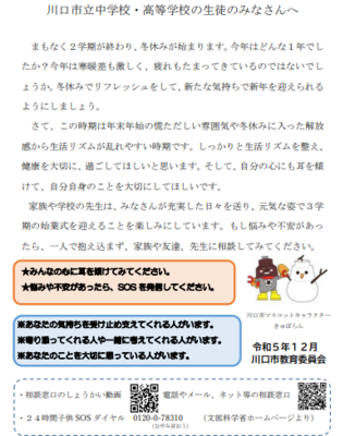 川口市教育委員会から冬休みを心身共に健康に過ごすためのメッセージが届きましたので掲載します。何か困ったこと、不安なことなどがあったら先生方・家族に相談してください。