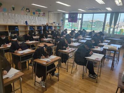 新年始まってすぐですが、3年生は入試に向けて最後の実力テストである校長会テストです。冬休みの勉強の成果を発揮しようとみんな必死です。早い人は2週間後には入試が始まります。体調管理にも気をつけながら勉強にはげんで欲しいです。