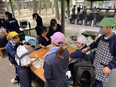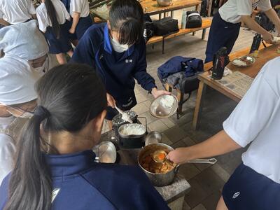 清水公園では、班ごとに協力して「飯盒炊爨(はんごうすいさん)」に挑戦しました。火おこしや野菜の下ごしらえ、カレー作りなど、普段はなかなかできない体験に、生徒たちは真剣な表情で取り組んでいました。