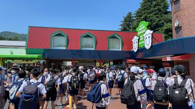今日は69期生1年生の中学校での初めての校外学習です。まずは学校の校庭で出発式!!天気がもって楽しめますように!!これからバスに乗って伊香保グリーン牧場に向かいます。
