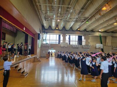 1学期終業式が行われました。校長先生からは3つのしてはいけない落とし物の話がありました。終業式のあとには、表彰と壮行会を行いました。