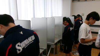 生徒の皆さんは、投票会場にて川口市の選挙管理委員会からお借りした本物の記入台で